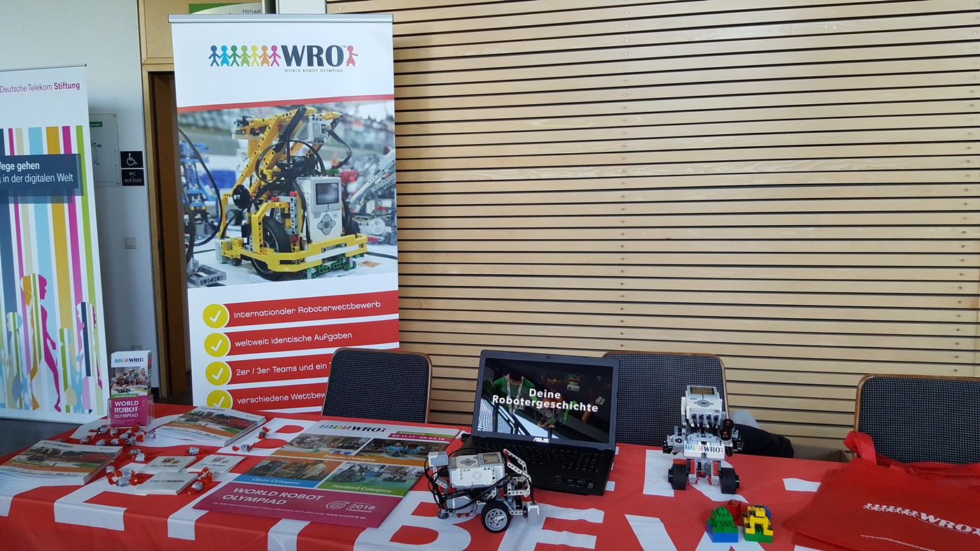 Beim dortigen Rahmenprogramm, der Roadshow „Making-Hacking-Coding“ konnten wir am vergangenen Freitag die WRO ausstellen. In zahlreichen interessanten Gesprächen mit Informatiklehrern aus ganz Deutschland informierten wir diese über unseren Wettbewerb und beantworteten die Fragen rund um den EV3 und die WRO in Deutschland.