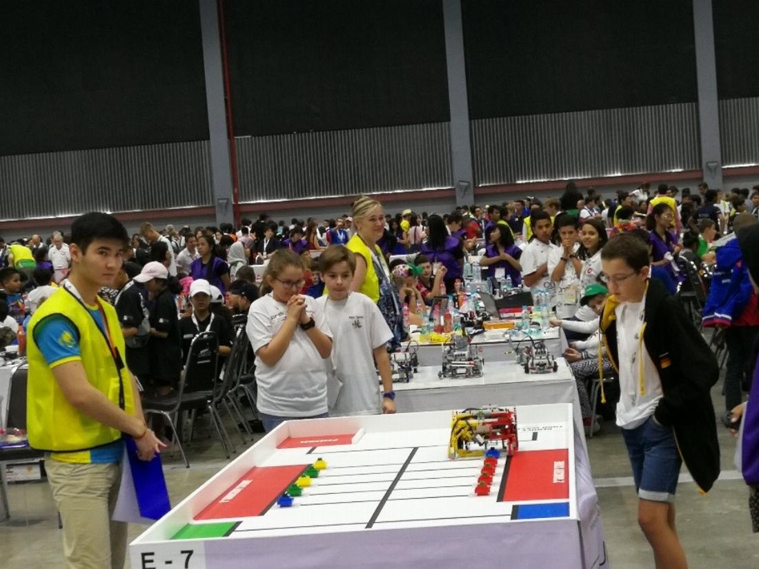 So, jetzt wird’s ernst. 5.30 Uhr aufstehen, die Busse fahren um 7.00 Uhr zur Veranstaltungshalle. Dort warten wir, bis wir um 8.00 Uhr eingelassen werden. Dann wieder warten, dass wir an unsere Tische dürfen. Den ganzen Tag testen wir den Roboter, passen ihn an die Lichtverhältnisse an und beschnuppern die anderen Teams bei uns am Tisch. Sie sind aus Weißrussland, Indien, Japan … Insgesamt 104 Elementary-Teams sind am Start. Abends ist dann die offizielle Eröffnung mit thailändischem Tanz, Trommel und einer ergreifenden Flaggenparade.