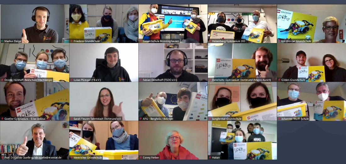 Die 14 Dortmunder Schulen, darunter Grundschulen, Förderschulen, Realschulen, Gesamtschulen und Gymnasien aus unterschiedlichen Stadtteilen, haben im Rahmen der heutigen Übergabe ihre Robotermaterialien erhalten. Sieben Schulen erhalten eine Förderung zum Start einer ersten Roboter-AG, sieben weitere Schulen bekommen Unterstützung beim Ausbau bereits bestehender Roboteraktivitäten. Aufgrund der aktuellen Corona-Situation konnte die Übergabe nur virtuell stattfinden, was der ausgelassenen und positiven Stimmung aller Beteiligten jedoch nicht geschadet hat. Nach einführenden Präsentationen und Vorstellungsrunden war Zeit zum Austausch gegeben.