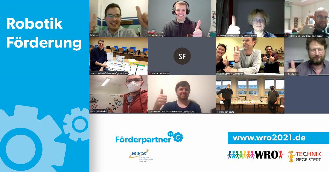 Die Berliner Schulen haben im Rahmen der heutigen Übergabe ihre Robotermaterialien erhalten. Sechs Schulen erhalten eine Förderung zum Start einer ersten Roboter-AG, drei weitere Schulen bekommen Unterstützung beim Ausbau bereits bestehender Roboteraktivitäten. Aufgrund der aktuellen Corona-Situation konnte die Übergabe nur virtuell stattfinden, was der ausgelassenen und positiven Stimmung aller Beteiligten jedoch nicht geschadet hat. Nach einführenden Präsentationen und Vorstellungsrunden war Zeit zum Austausch gegeben.
