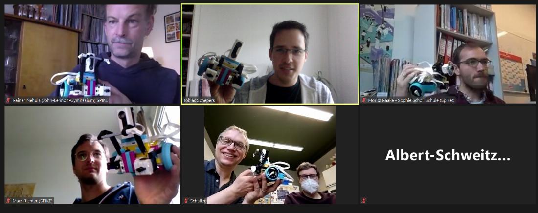 Am Freitag (7. Mai) fand eine Online-Schulung für Schulen in Berlin und Hamburg statt. Drei Vereinsmitglieder haben den Einsatz der LEGO-Roboter erläutert und erste Programmierübungen durchgeführt. Dazu haben wir die Lehrkräfte in mehrere Online-Konferenzräume eingeteilt, um optimal in Kleingruppen üben zu können (im Bild daher eine unserer Kleingruppen).