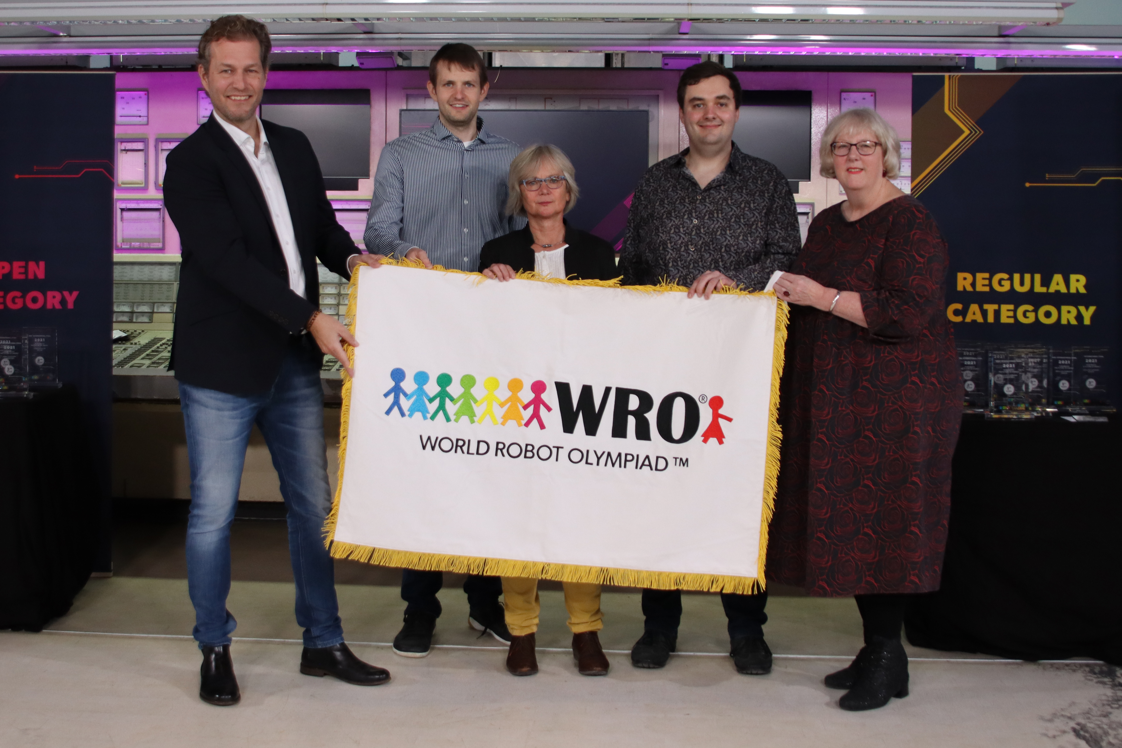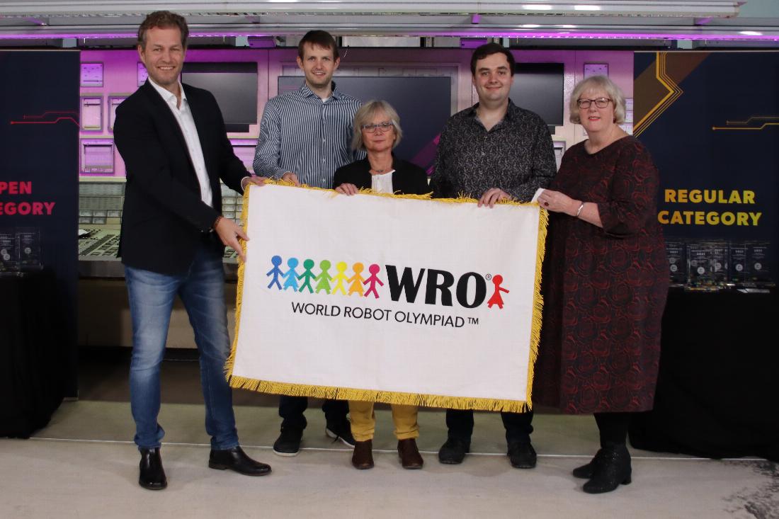 Personen im Bild von links nach rechts: Claus Ditlev Christensen (Secretary General WRO Association), Markus Fleige (Vorsitzender TECHNIK BEGEISTERT e.V.), Barbara Brunsing (Bürgermeisterin der Stadt Dortmund), Lukas Plümper (2. stellv. Vorsitzender TECHNIK BEGEISTERT e.V.), Cornelia Ferber (Leiterin Initiative Dortmunder Talent, Stadt Dortmund)