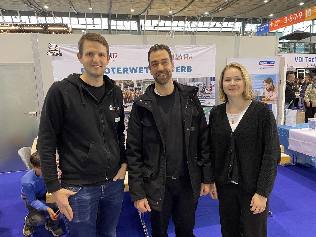 Im Bild (v. l. n. r.): Markus Fleige, Vorsitzender TECHNIK BEGEISTERT e.V., Ron Spelt, Gründer und Geschäftsführer make+mint und Jana Frommherz, Projektleitung make+mint beim Treffen auf der Spielemesse im November 2022.